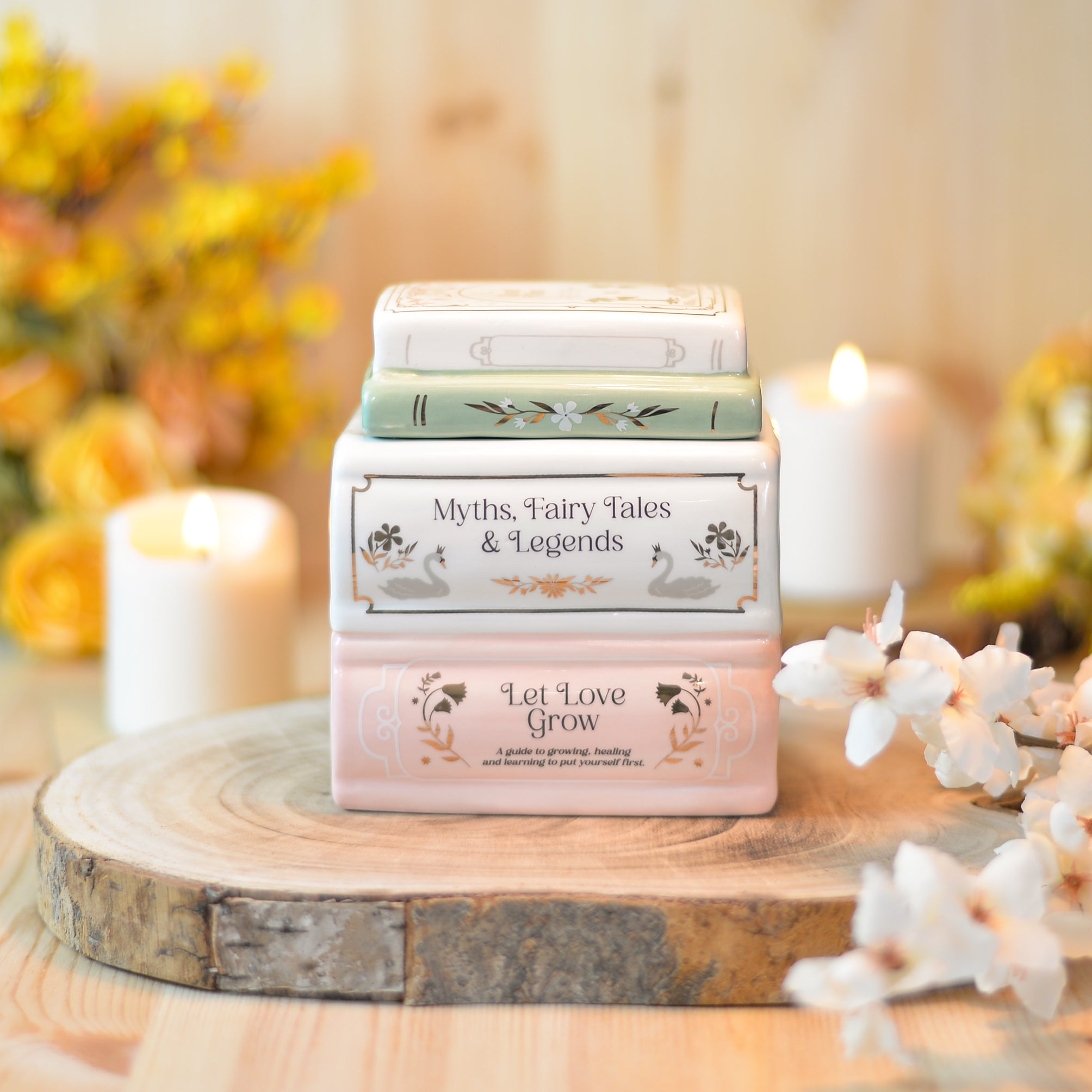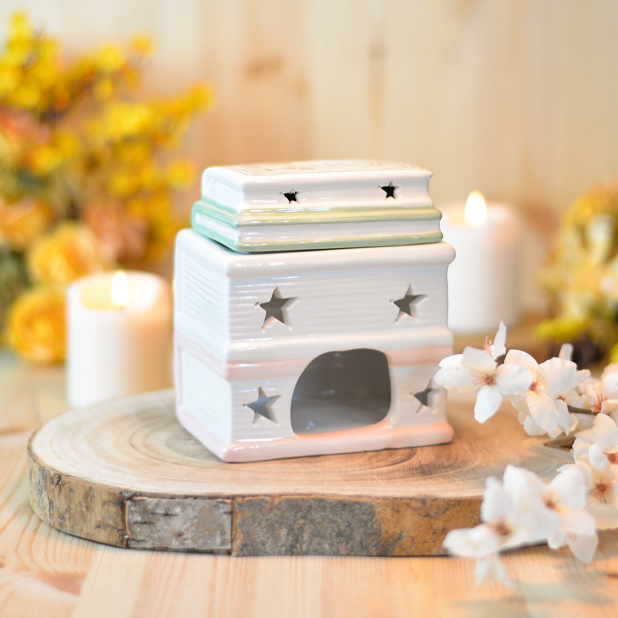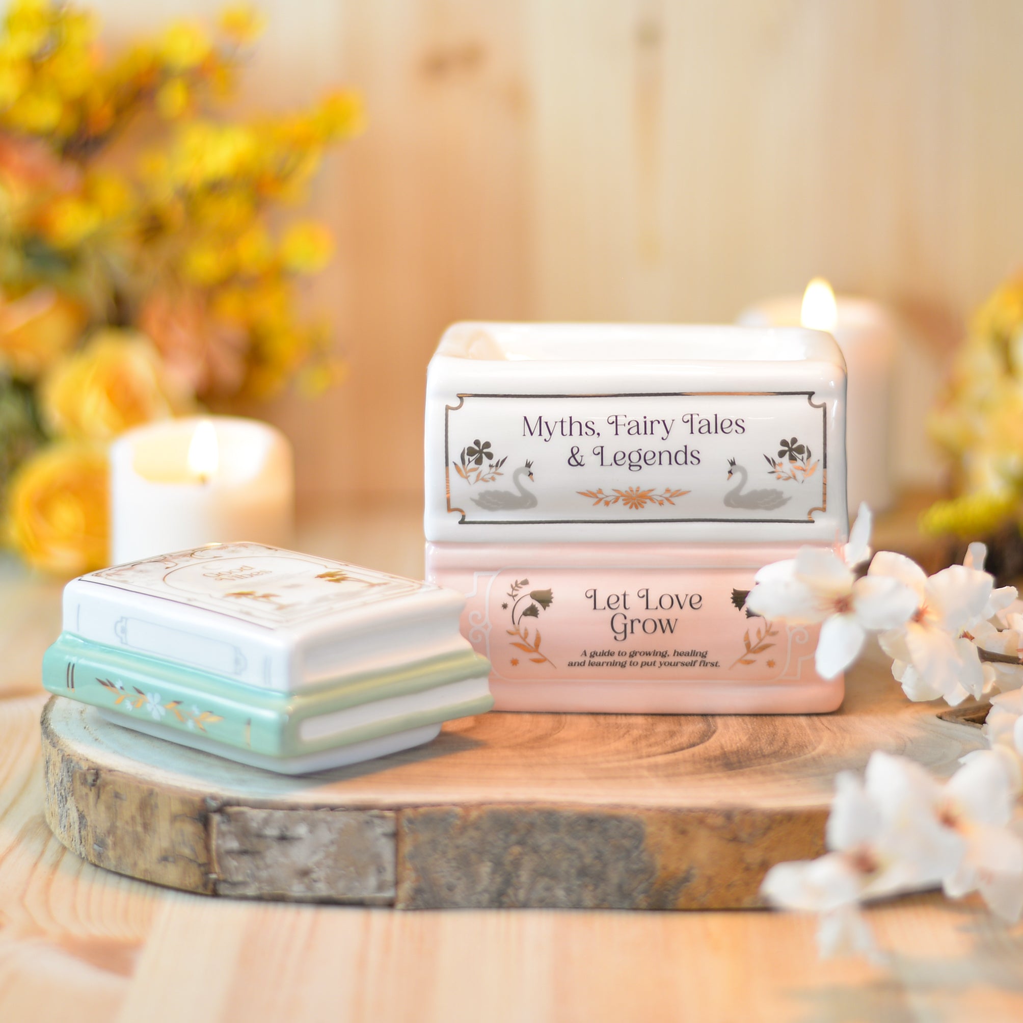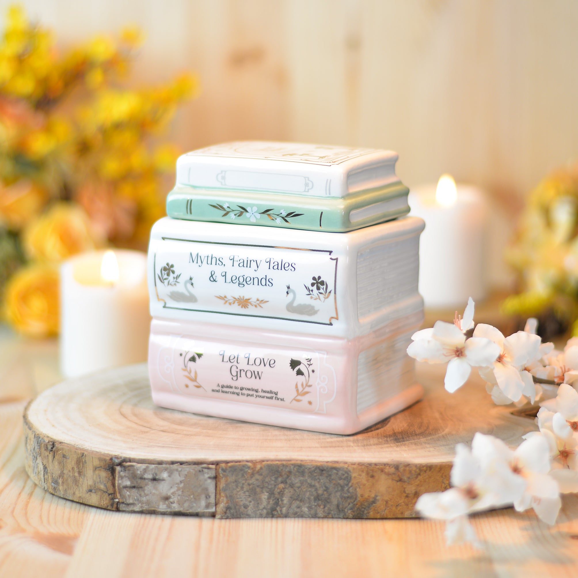 Este quemador de Wax Melts y aceites esenciales de cerámica está diseñado para quienes viven entre páginas y buscan rodearse de magia incluso fuera de los libros. Su encantador diseño apilando tomos favoritos lo convierte en el accesorio perfecto para cualquier rincón de lectura, despacho o biblioteca personal.