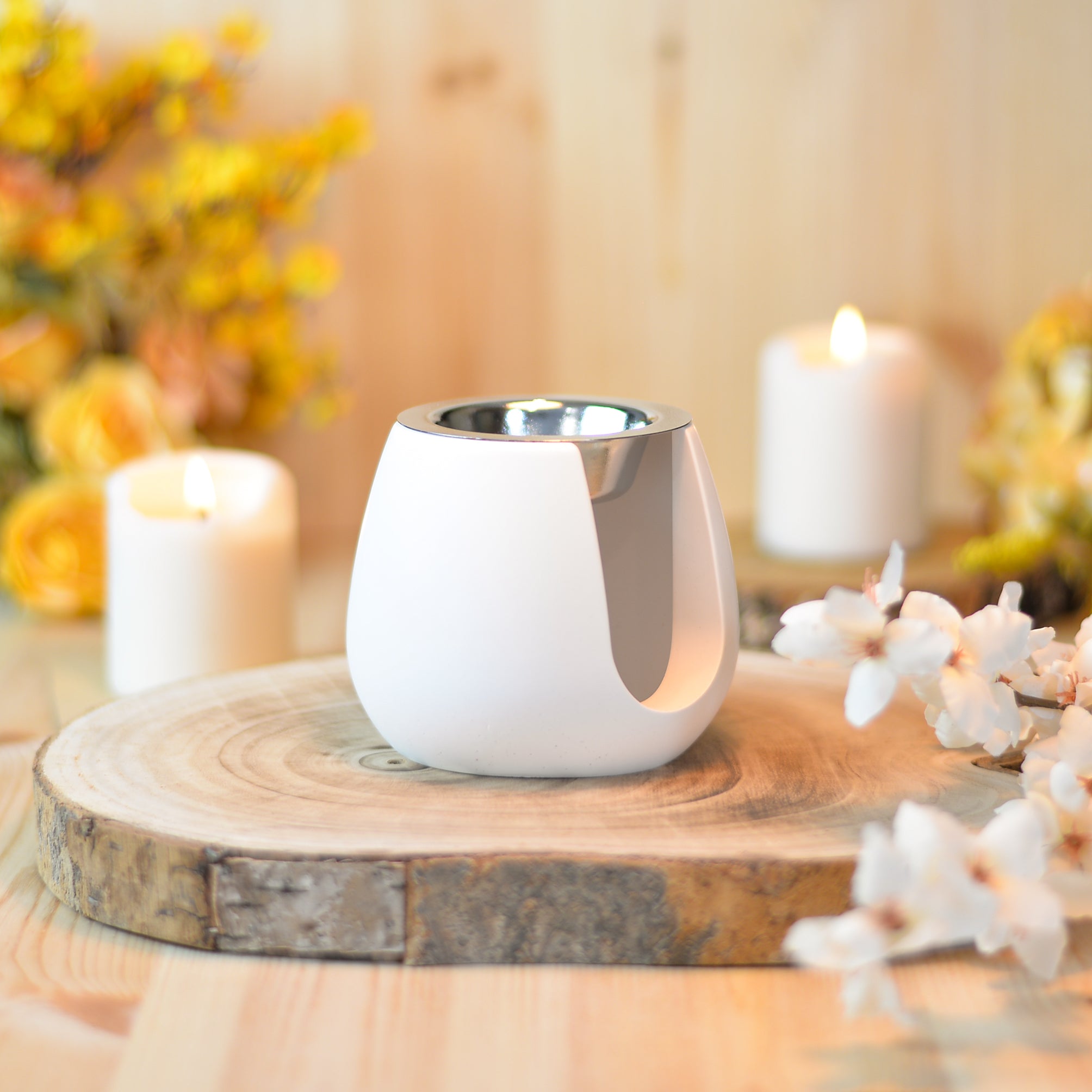 Solo necesitas colocar una vela de té en su interior y añadir tu wax melt artesanal o esencia aromática diluida en agua en la parte superior. El calor activará los aromas y llenará tu hogar de una fragancia envolvente, mientras su estructura redonda aporta equilibrio y serenidad visual.