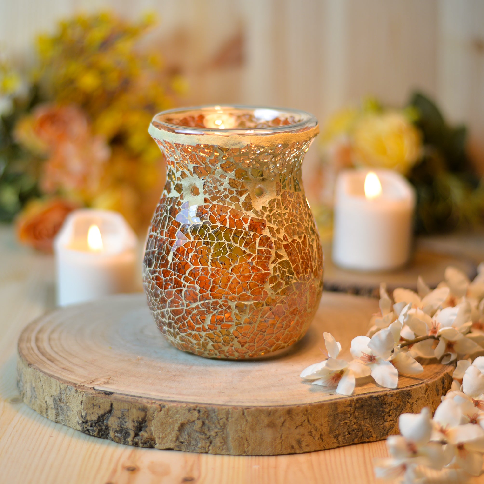 Este quemador de Wax Melts y aceites esenciales de gran tamaño deslumbra con su acabado craquelado en color naranja.